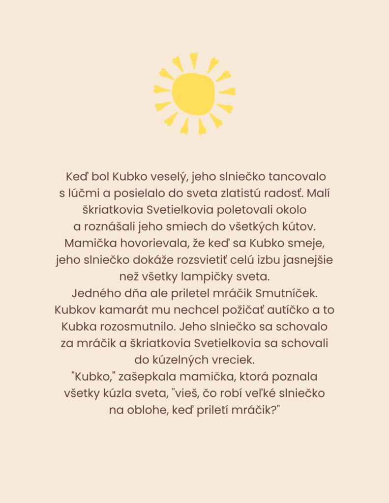 Predstavte si, ako vďaka jedinej rozprávke vaše dieťa pochopí, že sa hnev ani slzy nemusia potláčať, pretože aj jeho „slniečko v brušku“ občas zájde za mraky – ale ony zasa odídu.