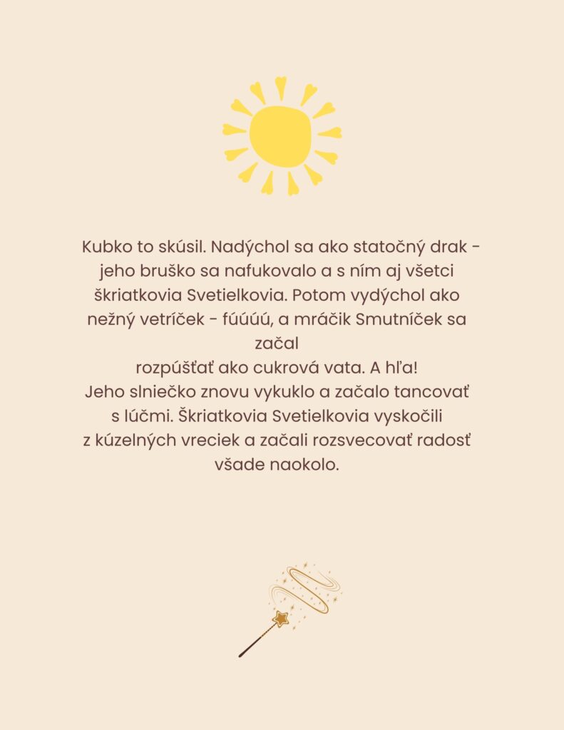 Väčšina kníh pre deti je plná „dobrých rád“. Ale čo keby stačilo povedať: „Vieš, Kubko mal tiež v brušku mráčik. Ale potom si spomenul, že má slniečko…“