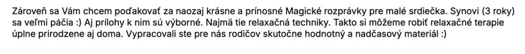 Preto som vytvorila Rozprávanky – liečivé príbehy pre vaše deti. Vychádzajú z múdrosti mnohých tradícií, príbehov a skúseností. Čerpajú z učenia Jaroslava Duška i môjho vlastného niekoľkoročného štúdia. Uvidíte, ako vaše deti rozkvitajú, ako rastú v sebavedomé a láskavé bytosti. Počujete ich úžasné príbehy, ako sa zbavili problémov, strachu i neistôt. Som nesmierne vďačná, že môžem vašim deťom sprostredkovať tento čarovný nástroj.